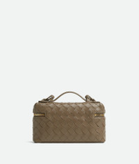 Intrecciato leather vanity case with detachable strap. Product Details - Intrecciato leather vanity case with detachable strap - One main compartment, one flat pocket - Zippered closure - Material: calfskin - Lining: Calfskin - Color: Pinecone - Hardware: Gold finish - Height: 13 cm | 5.1” - Width: 23 cm | 9” - Depth: 6 cm | 2.4” - Handle drop: 4.5 cm | 1.8” - Strap drop: 45 cm | 17.7” - Made in: Italy - Product code: 789109V3IV12355