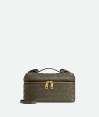 Vanity case in Intrecciato leather with detachable strap. Product Details - Intrecciato leather vanity case with detachable strap - One main compartment, one flat pocket - Zipped closure - Lining: Calf leather - Color: Cypress - Hardware: Gold finish - Height: 12.5 cm | 4.9" - Width: 22 cm | 8.7" - Depth: 5 cm | 2" -Handle drop: 4.5 cm | 1.8" -Strap drop: 45 cm | 17.7" - Made in: Italy - Product code: 789109V3IV13228 Size & Fit - Fits iPhone 16 Pro Max, a credit card case, airpods and keys.