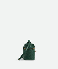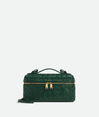 Intrecciato leather vanity case with detachable strap. Product Details - Intrecciato leather vanity case with detachable strap - One main compartment, one flat pocket - Zippered closure - Material: calfskin - Lining: Calfskin - Color: Emerald Green - Hardware: Gold finish - Height: 13 cm | 5.1” - Width: 23 cm | 9” - Depth: 6 cm | 2.4” - Handle drop: 4.5 cm | 1.8” - Strap drop: 45 cm | 17.7” - Made in: Italy - Product code: 789109V3IV13049