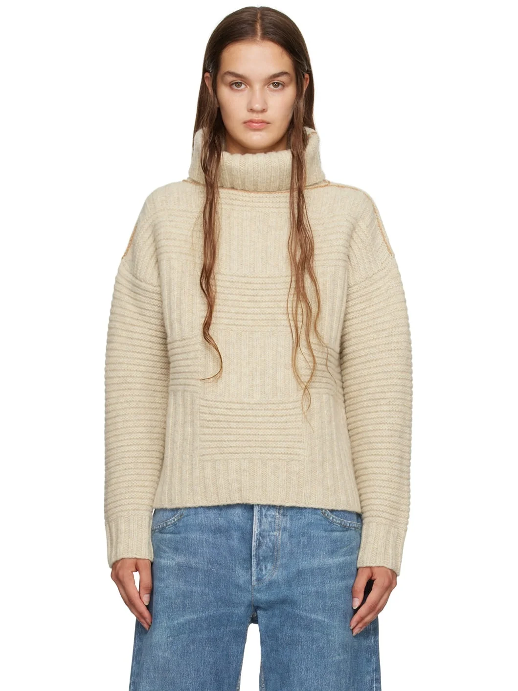 Rib knit stretch wool-blend turtleneck. · Rolled collar · Contrast stitching in tan Supplier color: Sea salt