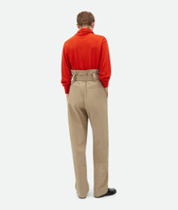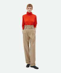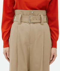Belted trousers in compact cotton. Product Details - Compact cotton belted trousers - Wide leg - High waist - Zip, snap buttons, and belt closure - Material: 67% cotton, 25% viscose, 8% polyester - Color: Sand - Made in: Italy - Product code: 815456VA5Y09733 Size & Fit - Model is 180 cm | 5'11" and is wearing a Bottega Veneta size 38