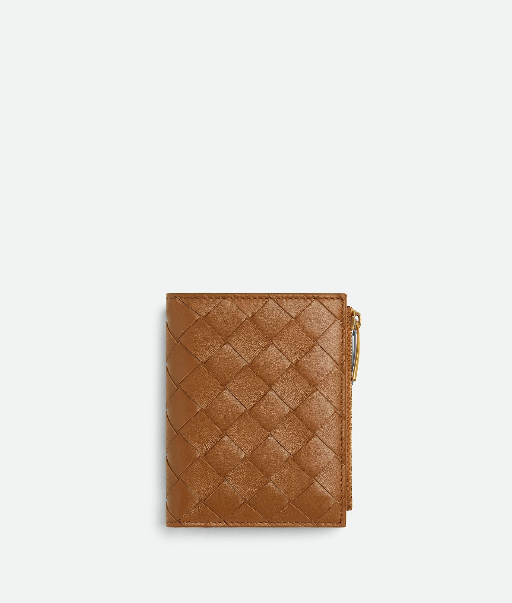 Intrecciato leather wallet. Make it unique with a handmade customization by Product details • Intrecciato leather wallet • Six card slots, one bill compartment, one zippered coin purse •Press stud closure Material: 100% Lambskin • Lining: Calfskin • Color: Wood • Hardware: Gold finish • Height: 11.5 cm | 4.5" • Width: 9 cm | 3.5" • Depth: 1 cm | 0.4" Made in: Italy