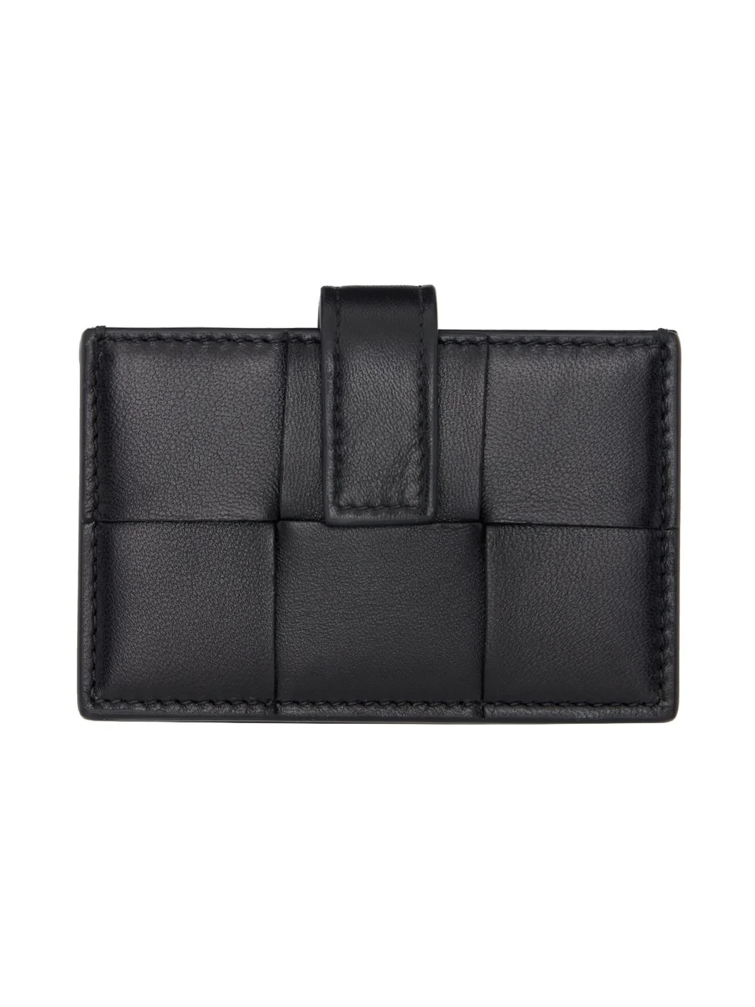 Intreccio-woven nappa calfskin card holder in black. · Burnished edges throughout · Accordion panel at sides · Press-stud tab · Four card slots · Grained leather and moire lining · H2.5" x W4" x D1" Supplier color: Black/Gold Calfskin. Made in Italy 242798F037007