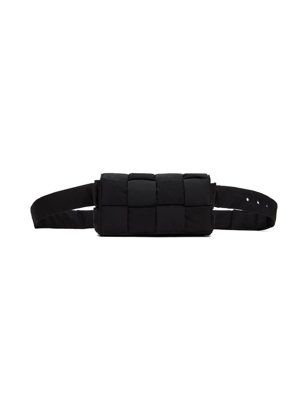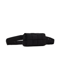 Intreccio-woven padded nylon taffeta pouch in black. · Adjustable belt-style strap · Magnetic closure at foldover flap · Card slot at interior · H4 x W7.5 x D2.5 in Supplier color: Black silver Textile. Made in Italy 231798F048072