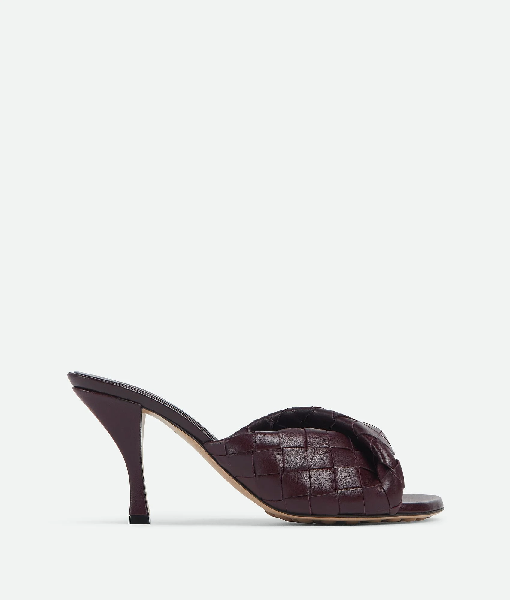 Mule with a folded detail in Intrecciato leather. Product Details - Intrecciato leather mule - Folded detail - Material: lambskin - Unlined - Color: Dark Barolo - Rubber-injected leather outsole - Heel: 8 cm | 3.1” - Made in: Italy - Product code: 796455V2ED02241
