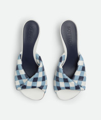 Kitten heel mule with a folded detail in Intrecciato leather with vichy pattern. Product Details - Vichy Intrecciato leather kitten-heel mule sandal - Folded detail - Unlined - Color: Abyss/New Ice/White - Rubber-injected leather outsole - Heel: 5 cm | 2" - Made in: Italy - Product code: 796464V5UR04127 Material - Material: Lambskin