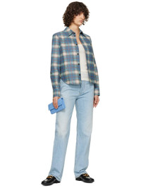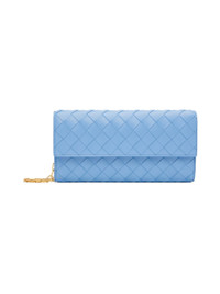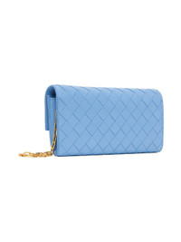 Intrecciato-woven grained calfskin shoulder bag in blue. · Detachable chain-link shoulder strap · Foldover flap with magnetic press-stud closure · Zip pocket at interior · Six card slots and one note slot · Buffed calfskin lining · Gold-tone hardware · H4 x W8.25 x D1.5 in Supplier color: Windswept/Gold Calfskin. Made in Italy 231798F048094