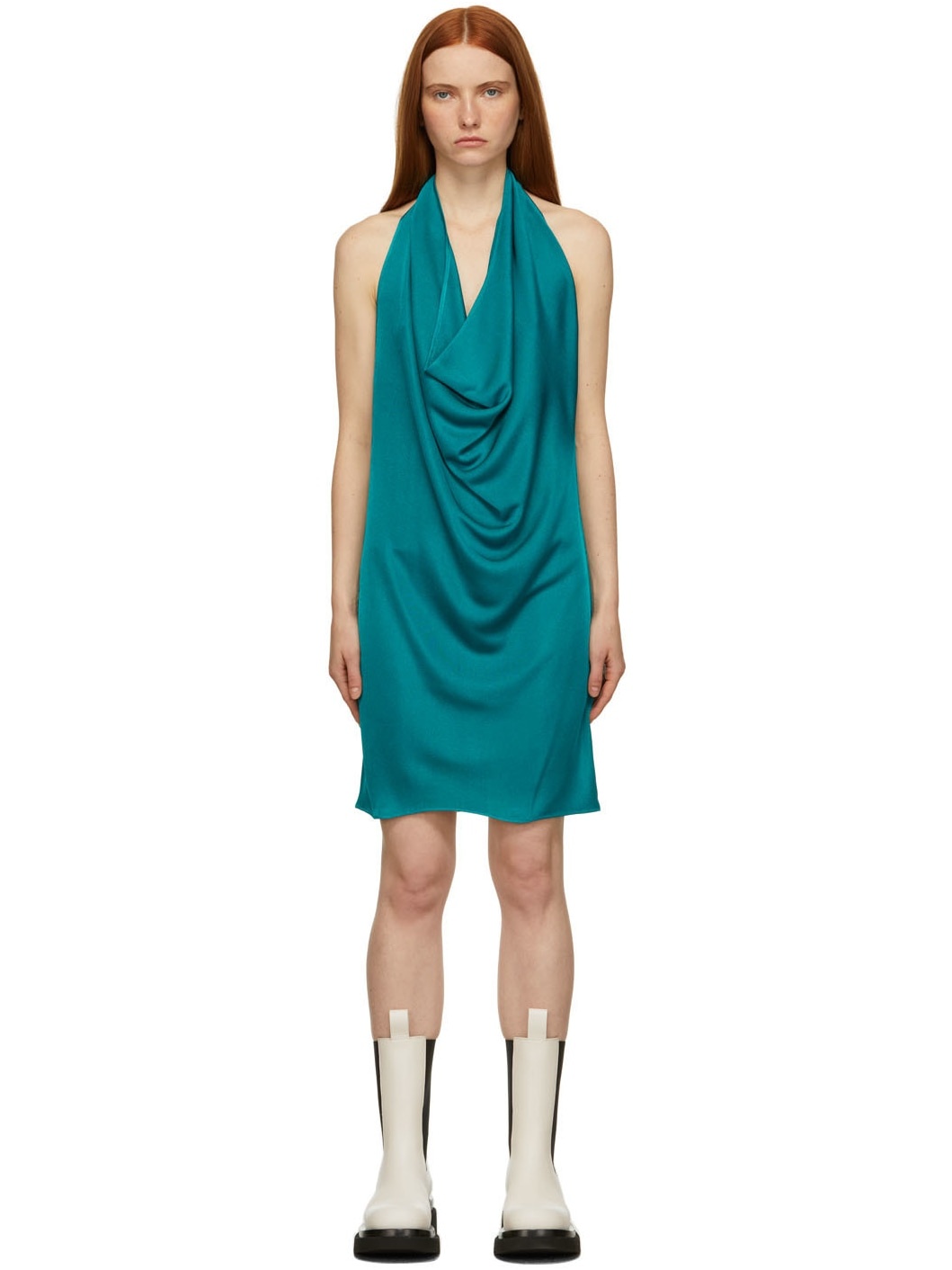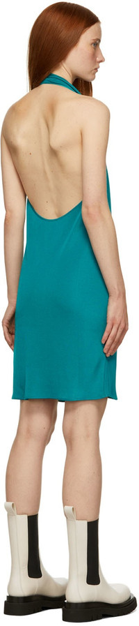 Sleeveless knit viscose short dress in blue. · Halter strap at cowl neck collar · Straight hem · Open back · Unlined Supplier color: Blaster 100% viscose.