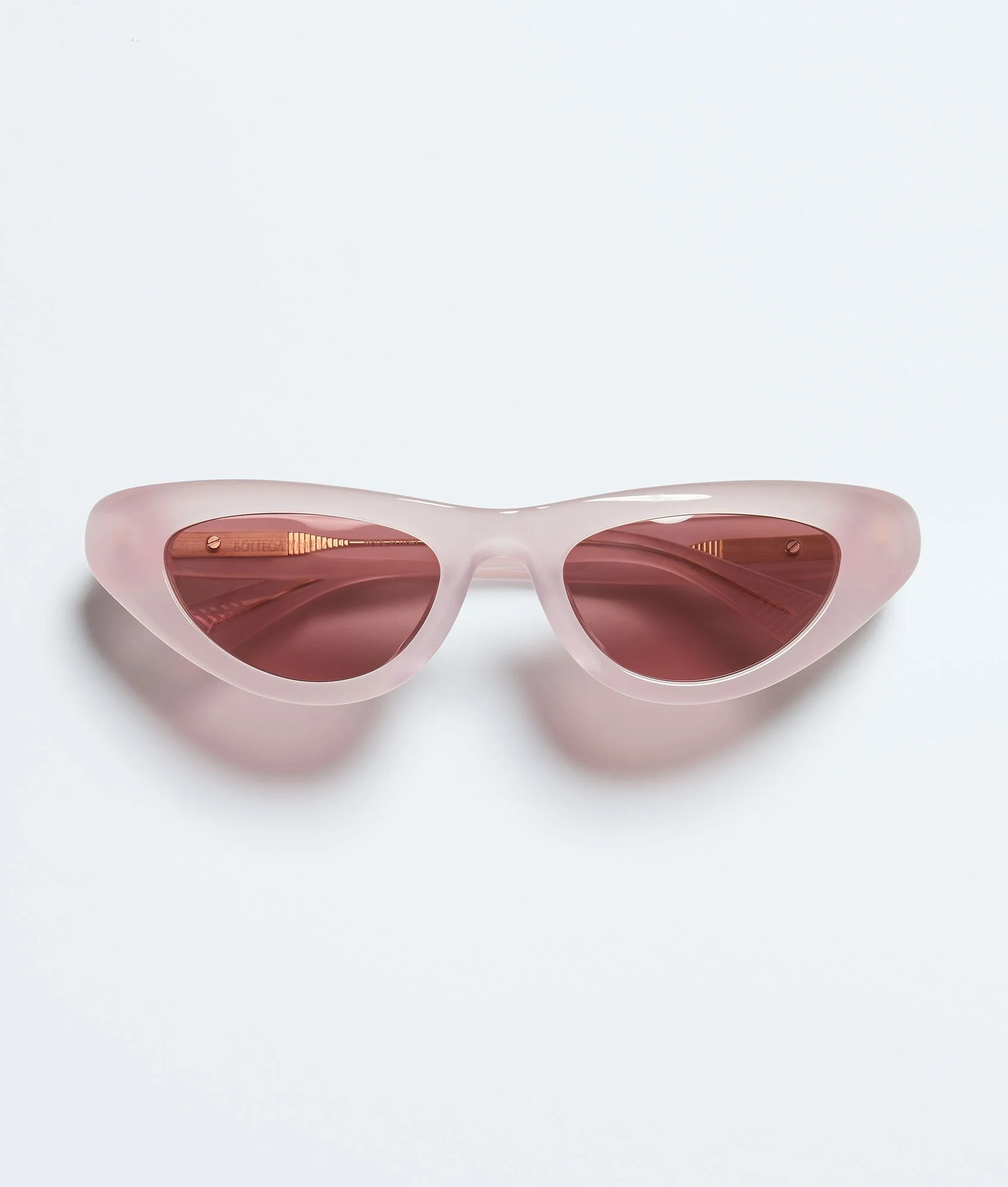 Cat eye sunglasses in recycled acetate with signature gold-finished ribbon detailing. Product Details - Cat eye sunglasses made with Eastman Acetate Renew, an acetate with 27% recycled content - Gold-finished ribbon detail at the temples - Lenses made from polyamide with 39% bio-based content - BV1450S 004 - Colour: Pink/Red - Made in: Italy - Product code: 872761V2Q305124 Material - Material: recycled acetate Size & Fit - Lens width: 51 mm | 2" - Bridge length: 20 mm | 0.8" - Temple length: 135 mm | 5.3"