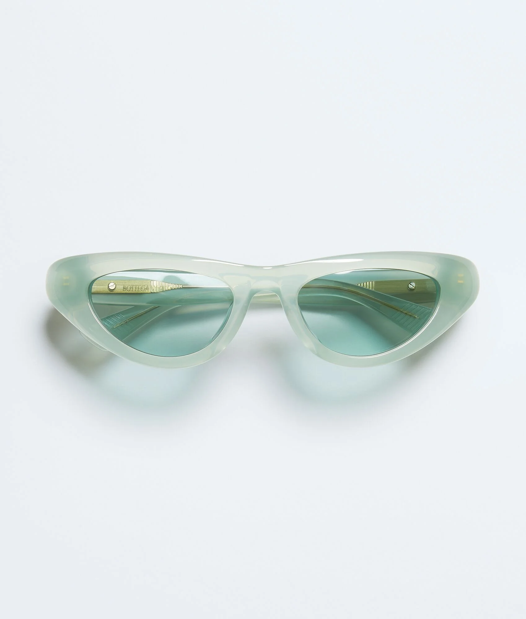 Cat eye sunglasses in recycled acetate with signature gold-finished ribbon detailing. Product Details - Cat eye sunglasses made with Eastman Acetate Renew, an acetate with 27% recycled content - Gold-finished ribbon detail at the temples - Lenses made from polyamide with 39% bio-based content - BV1450S 003 - Colour: Green - Made in: Italy - Product code: 872761V2Q303344 Material - Material: recycled acetate Size & Fit - Lens width: 51 mm | 2" - Bridge length: 20 mm | 0.8" - Temple length: 135 mm | 5.3"