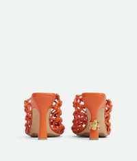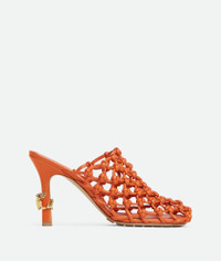Mule pump realised in woven, hand-knotted leather featuring a metallic frog embellishment Product Details - Woven hand-knotted leather mule pump - Metallic frog heel embellishment - Material: Lambskin - Unlined - Colour: Burned Orange - Hardware: Brass finish - Rubber injected leather outsole - Heel: 9 cm | 3.5” - Made in: Italy - Product code: 827683V3H657585