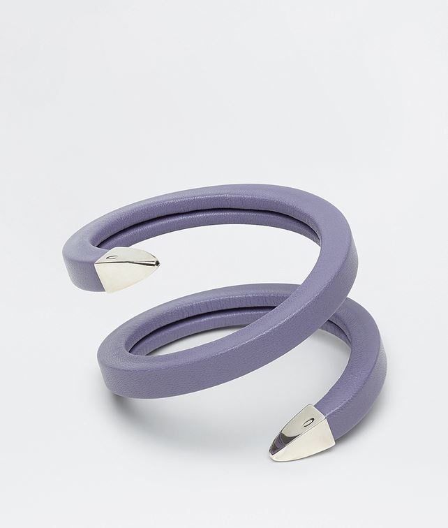 • Coiled cuff wrapped in Nappa • Serpent head Sterling Silver hardware DETAILS Composition: 30% Silver, 70% Lambskin Color: Lavender Hardware: Antique Silver finish Diameter: 5.4 cm | 2.1” Made in Italy
