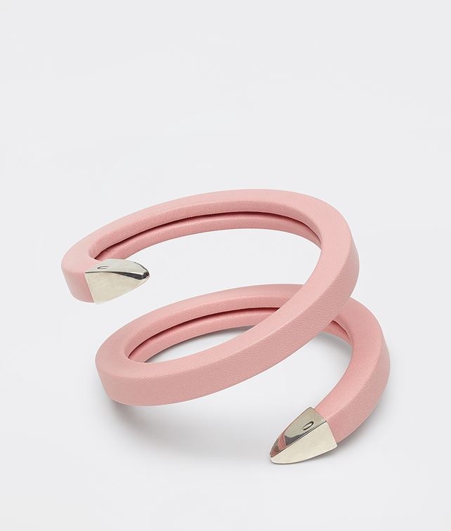 • Coiled cuff wrapped in Nappa • Serpent head Sterling Silver hardware DETAILS Composition: 30% Silver, 70% Lambskin Color: Blossom Hardware: Antique Silver finish Diameter: 5.4 cm | 2.1” Made in Italy