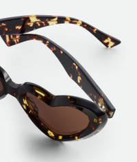 Product Details - Heart-shaped sunglasses made with Eastman Acetate Renew, an acetate with 27% recycled content - Narrow cat eye effect and facets all around the lenses and the inner contour of the frame - Lenses made from polyamide with 39% bio-based content - Gold-finished ribbon detail at the temples - Lens width: 55 mm | 2.2"; Bridge length: 18 mm | 0.7"; Temple length: 145 mm | 5.7" - BV1423S 002 - Color: Havana/Brown - Made in: Italy - Product code: 841213V2Q302819 Material - Material: Recycled acetate