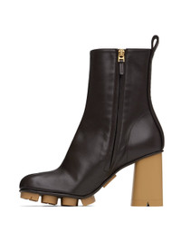 Ankle-high buffed lambskin boots in brown. · Square toe · Zip closure at inner side · Pull-loop at heel collar · Rubber block heel · Rubberized logo patch at sole · Buffed lambskin and treaded rubber sole · Heel: H3.5" Supplier color: Fondant Upper: lambskin. Sole: lambskin, rubber. Made in Italy 242798F113002
