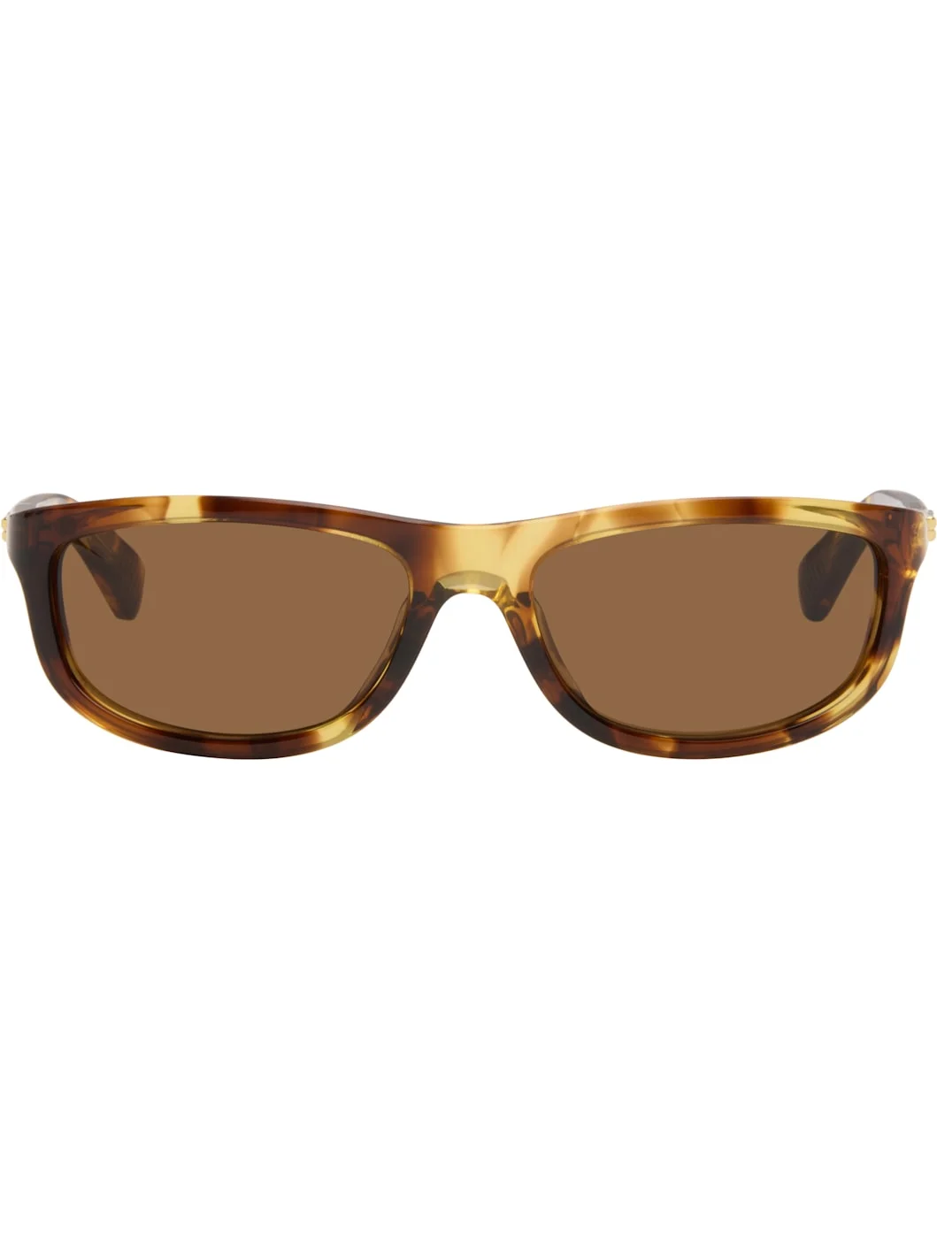 Rectangular tortoiseshell acetate-frame sunglasses. · Brown lenses · Integrated nose pads · Logo hardware at temples · Core wires · Includes case · Size: 58.17 125 Supplier color: Havana Acetate. Made in Italy 261798F005012