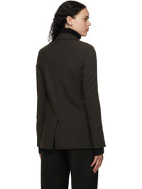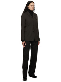 Long sleeve stretch wool-blend twill blazer in brown. Notched lapel collar. Button closure at front. Welt pocket at chest. Welt pockets at waist. Vented cuffs. Central vent at back hem. Partial satin lining. Tonal hardware. Supplier color: Fondant Body: 38% polyamide, 33% polyester, 26% wool, 3% elastane. Lining: 95% cupro, 5% elastane. Made in Italy 202798F057020
