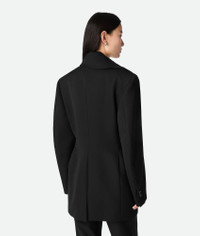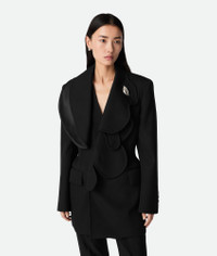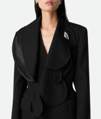 Sculptural jacket realised in compact wool with rabbit shaped lapels and metal rabbit Product Details - Compact wool jacket - Rabbit lapels - Metal rabbit eye brooch - Button closure - Sculptural fit - Material: 100% Wool - Color: Black - Made in: Italy - Product code: 825684VKIV01000 Size & Fit - Model is 178 cm | 5'10" and is wearing a Bottega Veneta size 38
