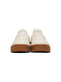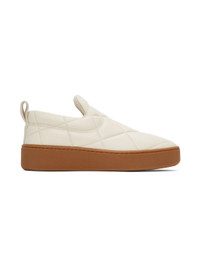 Low-top lambskin slip-on sneakers in off-white. Pattern embossed throughout. Round toe. Padded collar. Tonal webbing pull-loop at heel collar. Tonal terrycloth lining. Textured rubber midsole in tan. Treaded rubber outsole in tan. Supplier color: Wax Upper: lambskin. Sole: rubber. Made in Italy 202798F128367