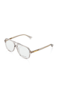 Bottega Veneta's eyewear collection reimagines iconic silhouettes in bold new volumes. These glasses have aviator frames made from transparent acetate. The gold ribbon temples are a brand signature. PRODUCT DETAILS - Composition: recycled acetate - Made in Italy