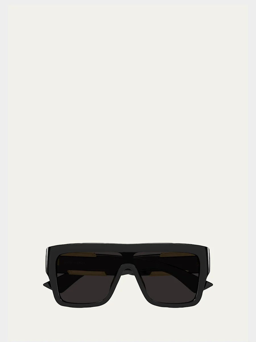 The "BV1451S001" rectangular sunglasses by Bottega Veneta showcase goldtone ribbon on the arms Lens/bridge/temple (in mm): 991145 Solid lenses Saddle nose bridge Wide, tapered arms Acetate 100% UVA/UVB protection Made in Japan