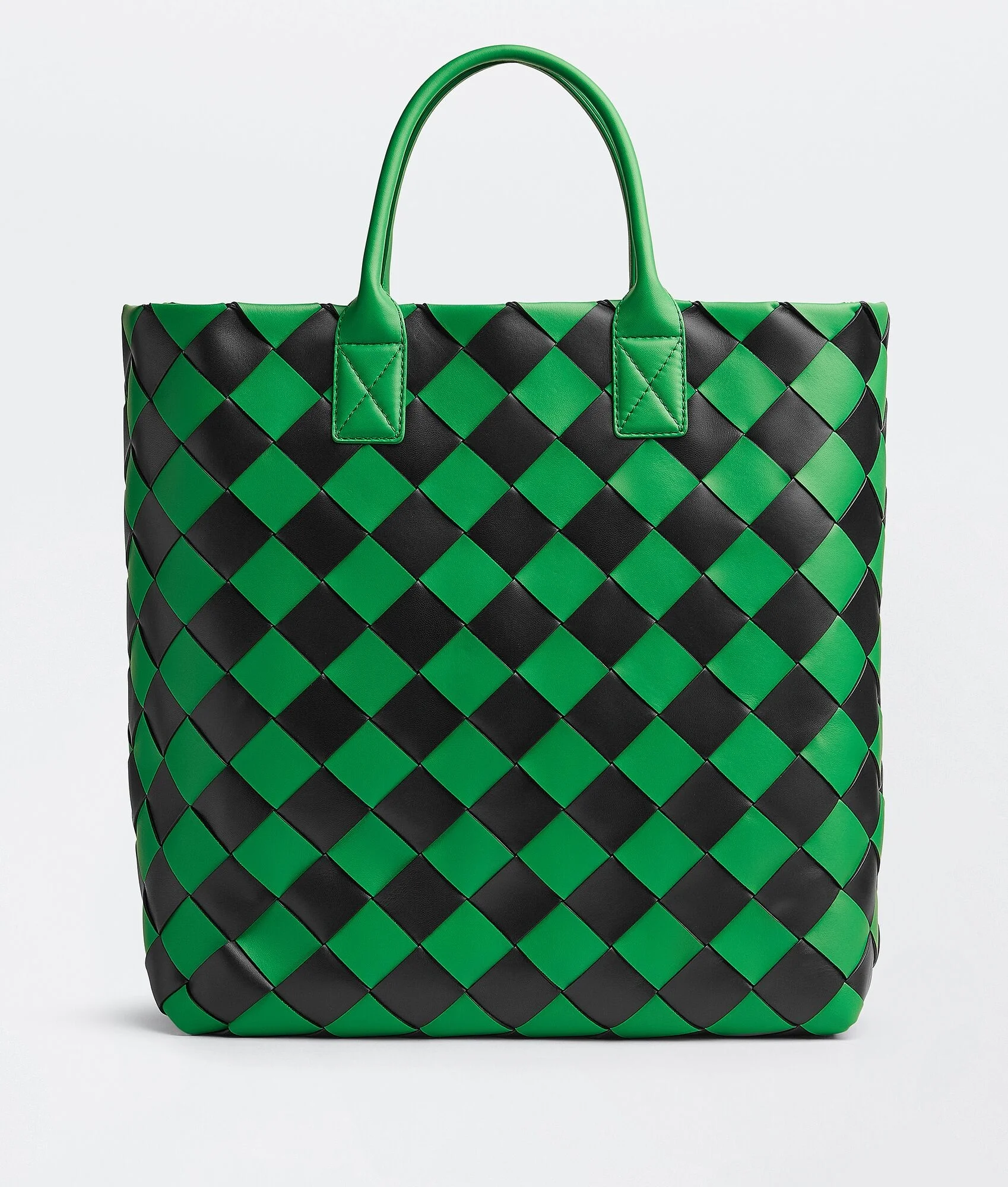 Product Details - Large intrecciato leather tote bag - Single detachable interior zipped pocket with exterior card slots - Material: lambskin - Lining: Lambskin bonded Intrecciato - Color: Grass/Black - Hardware: Gold finish - Height: 62 cm | 13.9" - Width: 41 cm | 13.3" - Depth: 17 cm | 6.2" - Handle Drop: 19 cm | 8.6" - Made in: Italy - Product code: 569041VMAA03715