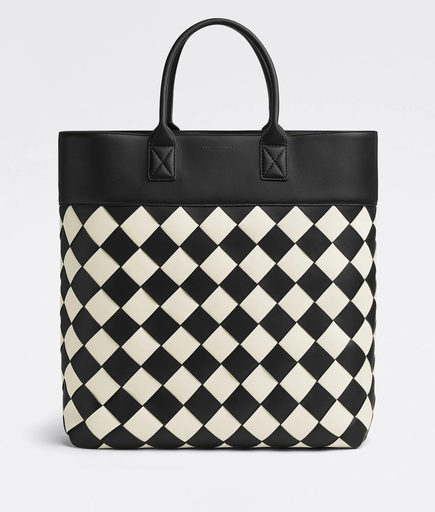 Product Details - Large intrecciato leather tote bag - Single detachable interior zipped pocket with exterior card slots - Material: lambskin - Lining: Lambskin - Color: Black/Mist - Hardware: Silver finish - Height: 62 cm | 13.9" - Width: 41 cm | 13.3" - Depth: 17 cm | 6.2" - Handle Drop: 19 cm | 8.6" - Made in: Italy - Product code: 568401VMAA18805