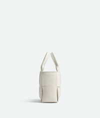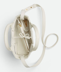 Micro intreccio grained leather tote bag with detachable strap. Product Details - Micro intreccio grained leather tote bag with detachable strap - Single detachable interior zipped pocket - Leather string closure - Material: calfskin - Lining: Bonded suede Intreccio - Color: White - Hardware: Gold finish - Height: 13 cm | 5.1" - Width: 20 cm | 7.9" - Depth: 7 cm | 2.8" - Handle drop: 8.5 cm | 3.3" - Strap drop: 50 cm | 19.7" - Made in: Italy - Product code: 729029VCP119009 Size & Fit - Fits iPhone 15 Pro Max, a credit card case, airpods and keys.