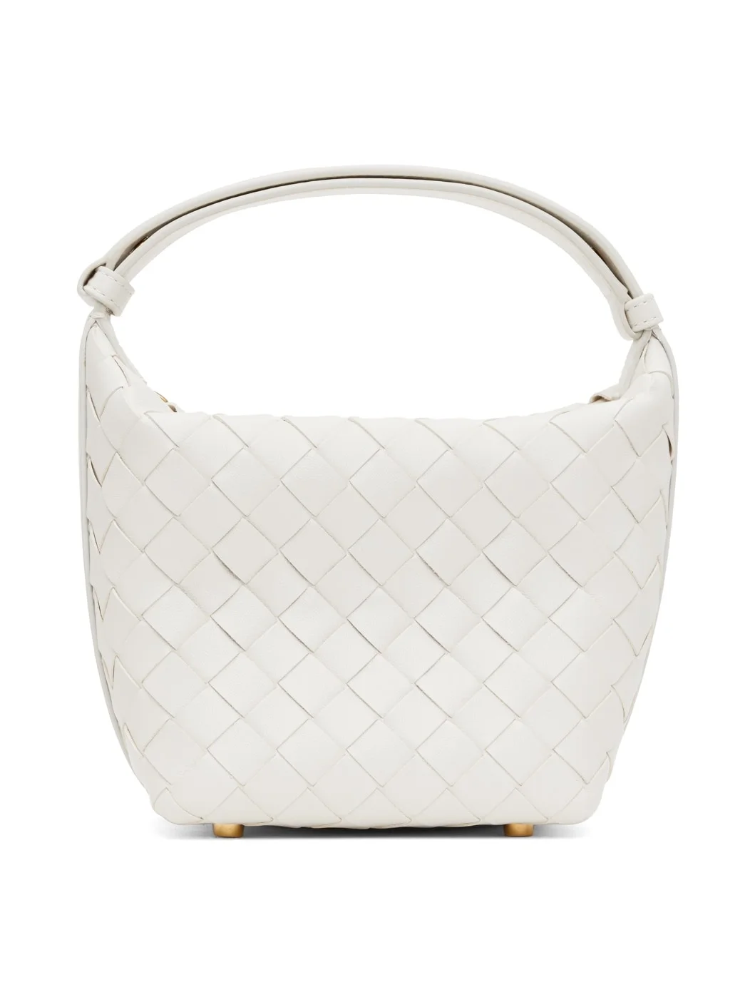 Intrecciato-woven grained calfskin shoulder bag in white. · Adjustable shoulder strap · Bumper studs at base · Zip closure · Buffed calfskin lining · Gold-tone hardware · H6.75" x W8" x D4.5" Supplier color: White/Gold Calfskin. Made in Italy 242798F046012
