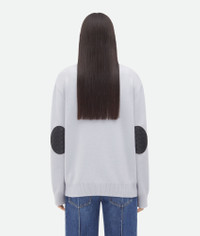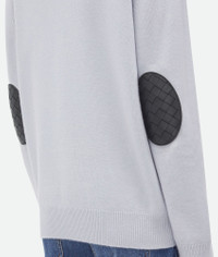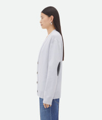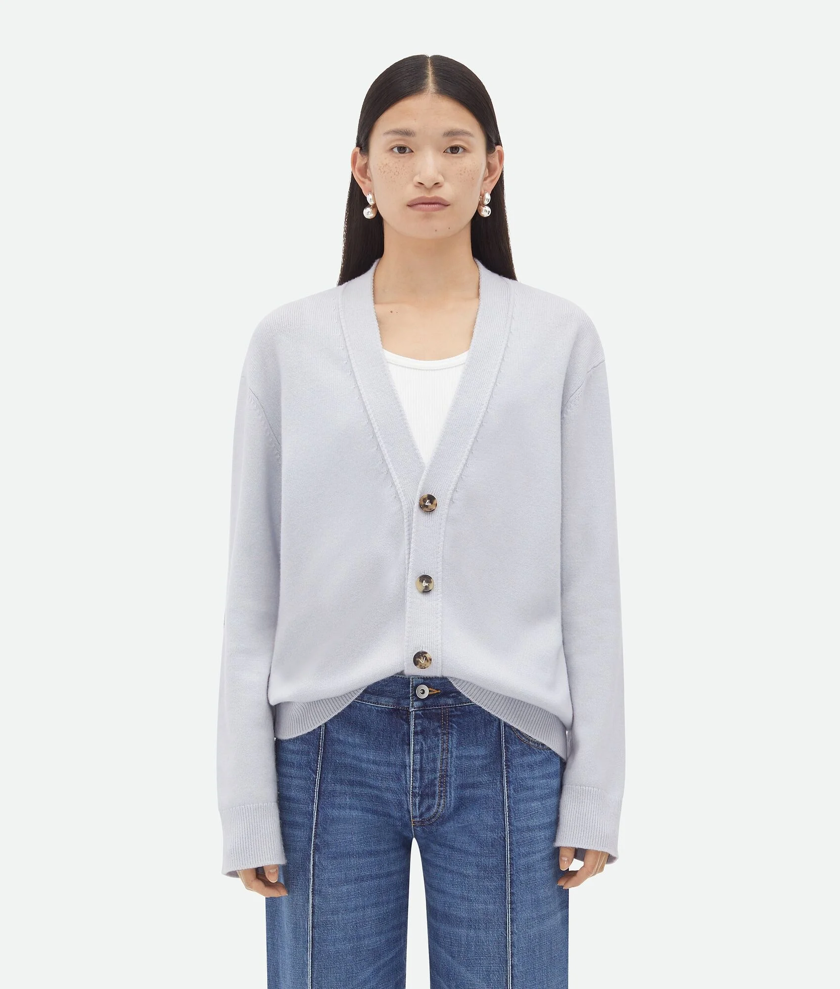 Cardigan in classic cashmere with signature Intrecciato leather patches. Product Details - Classic cashmere cardigan - Intrecciato leather patches detail - Button closure - Relaxed fit - Material: 97% Cashmere, 2% Polyamide, 1% Elastane - Color: Morning Mist - Made in: Italy - Product code: 774699V2MM01582 Size & Fit - Model is 180 cm | 5'11" and is wearing a Bottega Veneta size S