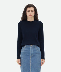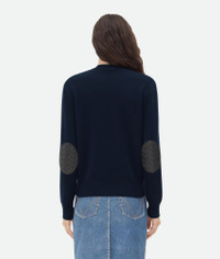 Jumper with crew neck realised in 100% soft cashmere and signature Intrecciato leather Product details • Cashmere crew neck jumper • Intrecciato leather patches detail • Unlined • Relaxed fit Material: 97% Cashmere, 2% Poliammied, 1% Elastane • Color: Navy Made in: Italy Size & fit • Model is 177 cm | 5'9" and is wearing a Bottega Veneta size S