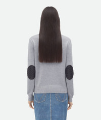 Jumper with crew neck realised in 100% soft cashmere and signature Intrecciato leather Product details • Cashmere crew neck jumper • Intrecciato leather patches detail • Unlined • Relaxed fit Material: 97% Cashmere, 2% Poliammied, 1% Elastane • Color: Veil Melange Made in: Italy Size & fit • Model is 180 cm | 5'11" and is wearing a Bottega Veneta size S