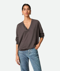 V-neck jumper in lightweight fine cashmere. Product Details - Lightweight fine cashmere V-neck jumper - "BV" embroidery on the front - Relaxed fit - Material: 100% cashmere - Color: Milk Chocolate - Made in: Italy - Product code: 811516V4B702185 Size & Fit - Model is 176 cm | 5'9" and is wearing a Bottega Veneta size S
