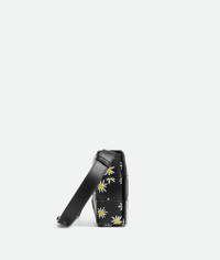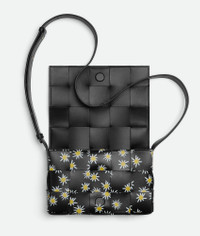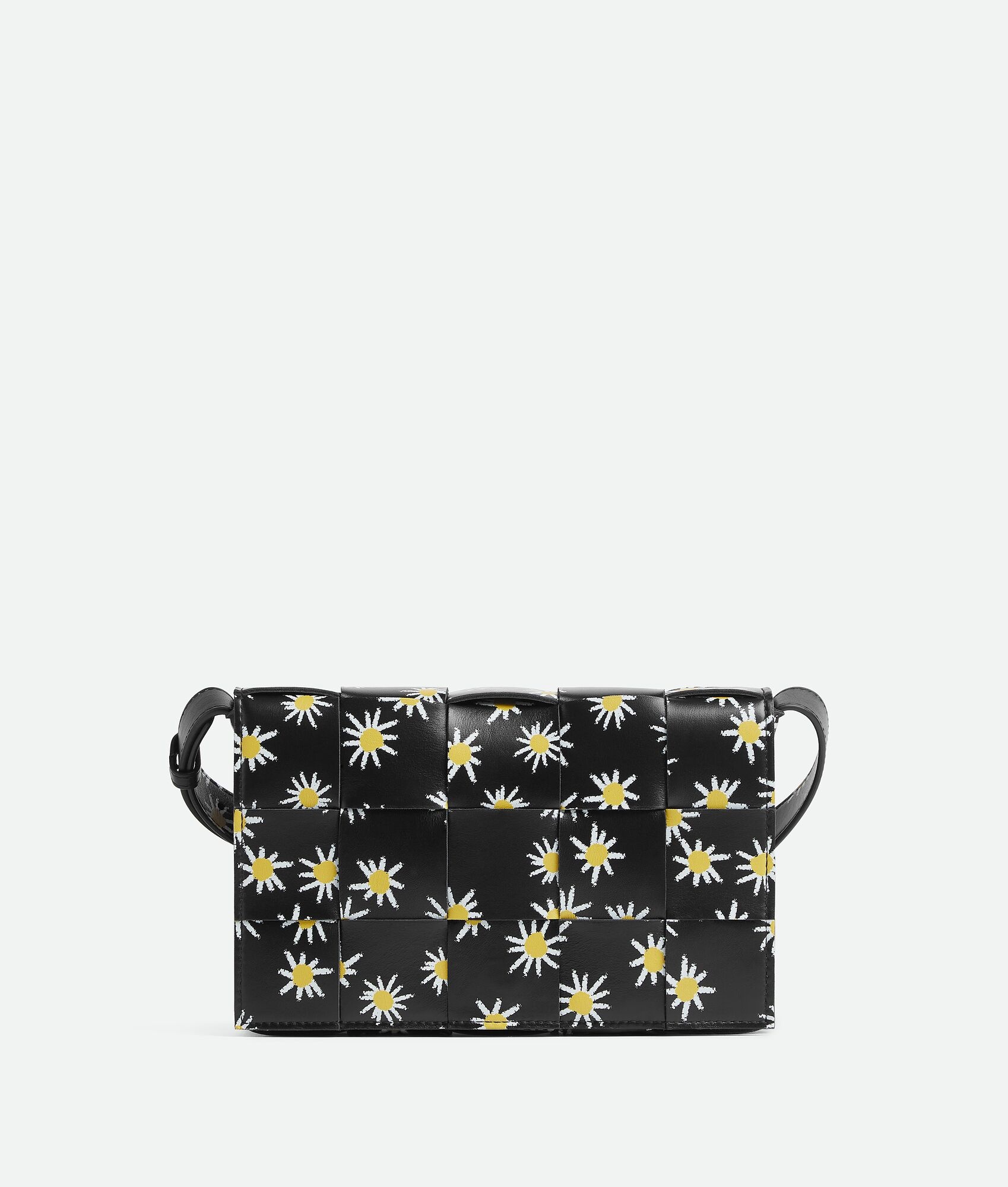 Cross-body bag realised with Intreccio craftsmanship in soft lambskin leather with Product details • Intreccio leather cross-body bag embellished with irregular daisy print • Single interior zippered pocket • Magnetic closure Material: 100% Calfskin • Lining: Calfskin bonded Intreccio • Color: Black/White/Yellow • Hardware: Brass finish • Height: 15 cm | 5.9" • Width: 23 cm | 9.1" • Depth: 5.5 cm | 2.2" • Strap drop: 55 cm | 21.7" Made in: Italy