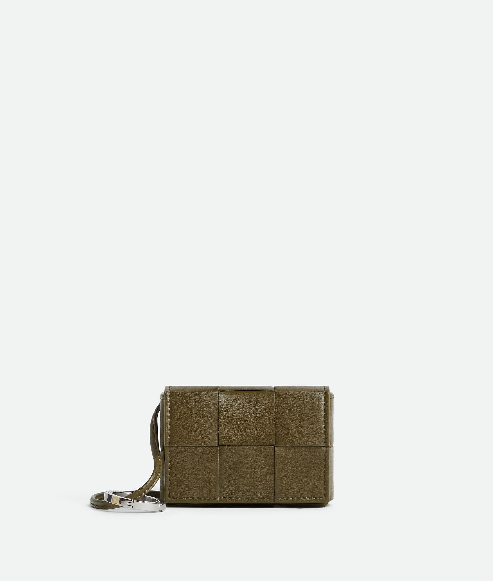 Intreccio calfskin leather AirPods case with necklace strap and hook ring Product Details - Single main compartment - Magnetic closure - Material: Calfskin - Lining: Unlined - Color: Mud - Hardware: Silver finish - Height: 6 cm | 2.4" - Width: 9 cm | 3.5" - Depth: 3 cm | 1.2" - Handle drop: 45 cm | 17.7" - Made in: Italy - Product code: 765784VBWD32877
