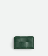 Intreccio leather card case. Make it unique with a handmade customization by Product Details - Intrecciato leather card holder - One compartment, one card slot - Press stud closure - Material: lambskin, calfskin - Lining: Calfskin - Color: Thunder - Hardware: Gold finish - Height: 7.5 cm - Width: 12.2 cm - Depth: 2.5 cm - Made in: Italy - Product code: 651396VCQC43035