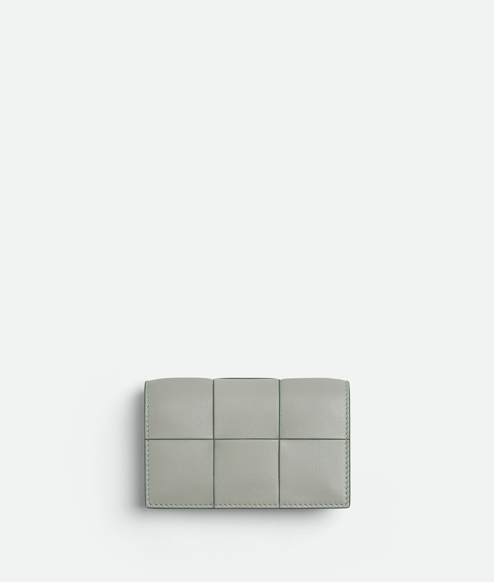 Intreccio nappa card case with contrasted edges. Make it unique with a handmade Product Details - One compartment, one card slot -Press stud closure - Material: Calfskin - Lining: Calfskin - Color: Agate Grey/Aloe - Hardware: Gold finish - Height: 7.5 cm | 3" - Width: 12.2 cm | 4.8" - Depth: 2.5 cm | 1" - Made in: Italy - Product code: 651396V2PN11582