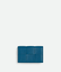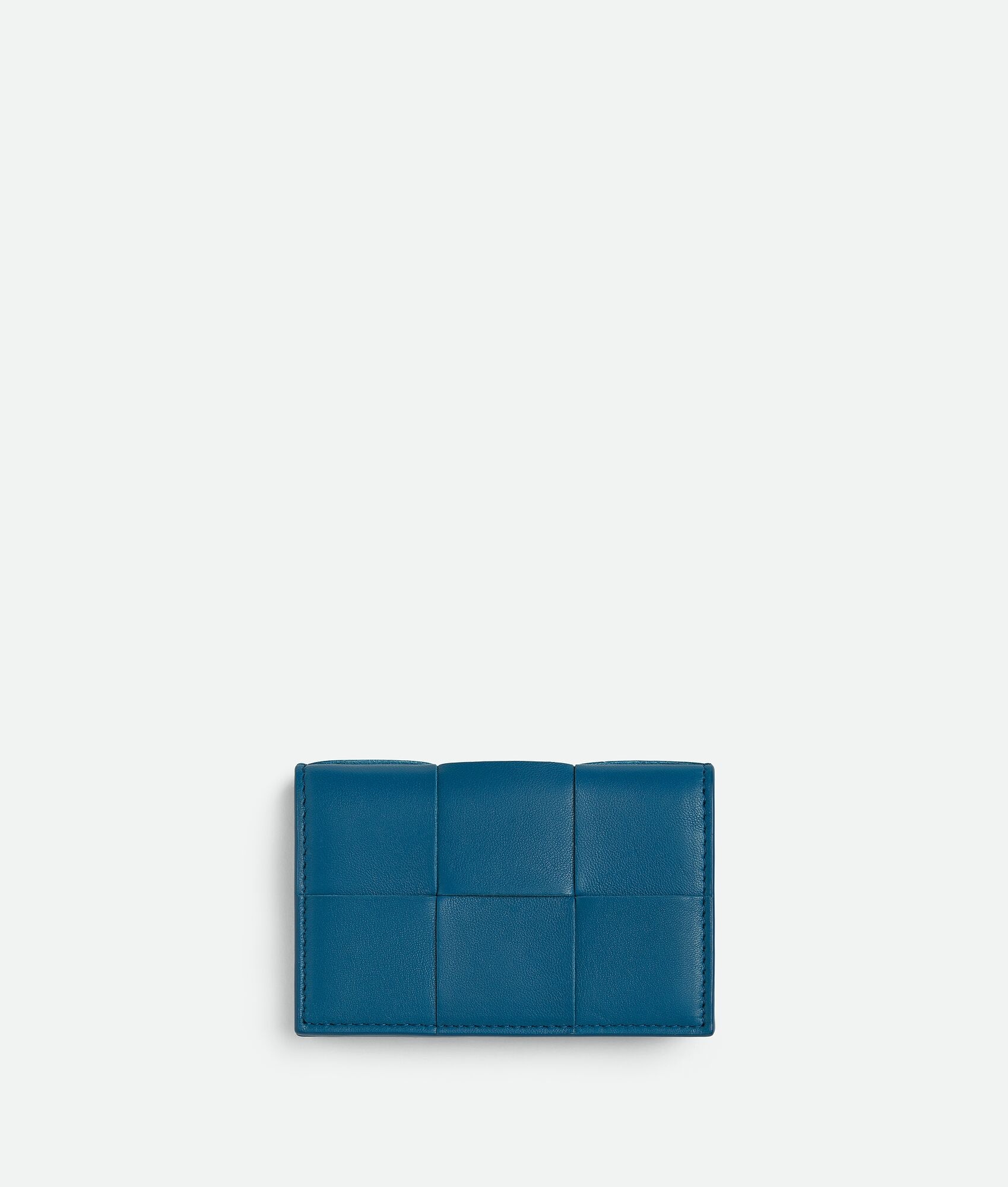 Intreccio nappa card case. Make it unique with a handmade customization by our Product Details - One compartment, one card slot -Press stud closure - Material: lambskin, calfskin - Lining: Calfskin - Color: Deep Pacific - Hardware: Gold finish - Height: 7.5 cm | 3" - Width: 12.2 cm | 4.8" - Depth: 2.5 cm | 1" - Made in: Italy - Product code: 651396VCQC44222