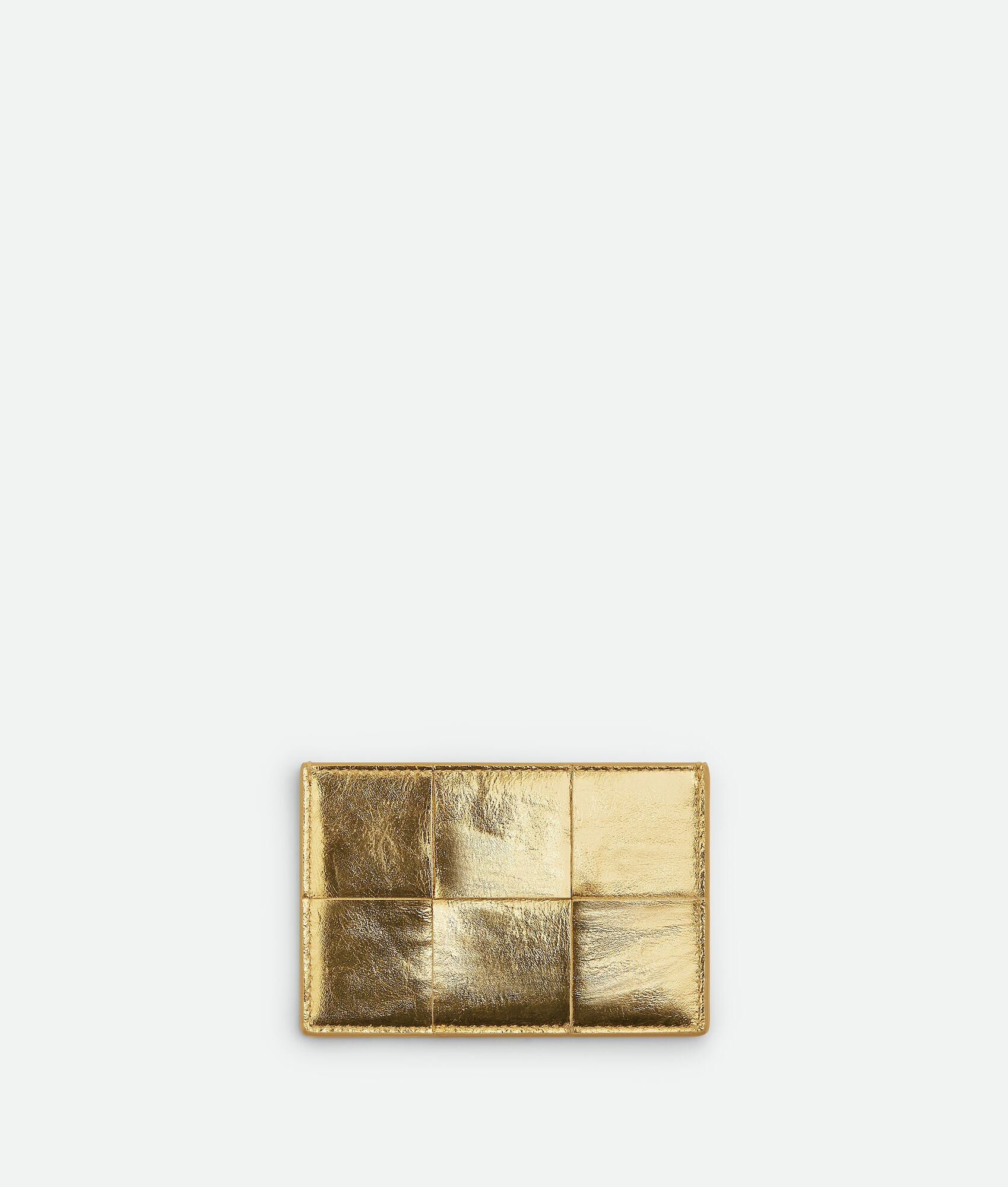 Intreccio laminated nappa card case. Product details • Three card slots, one central pocket Material: 100% Lambskin • Lining: Lambskin • Color: Gold • Height: 7.6 cm | 3" • Width: 11.4 cm | 4.5" • Depth: 0.5 cm | 0.2" Made in: Italy