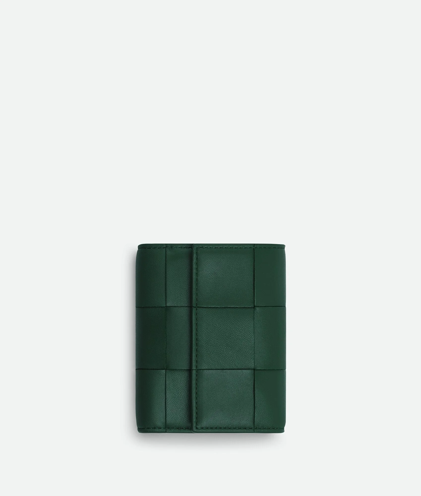 Intreccio nappa wallet. Make it unique with a handmade customization by our artisans. Product Details - Six card slots, one bill compartment, two additional pockets, one zippered coin purse -Press stud closure - Material: lambskin - Lining: Calfskin - Color: Emerald Green - Hardware: Gold finish - Height: 9 cm | 3.5" - Width: 11.5 cm | 4.5" - Depth: 2 cm | 0.8" - Made in: Italy - Product code: 814686VCQC13049