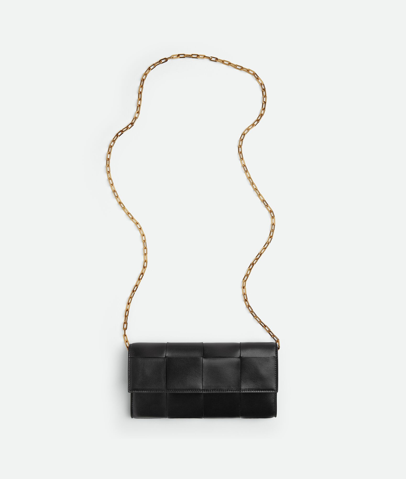 Intreccio leather wallet on chain. Product details • Intreccio leather wallet on chain • Two main compartments, six card slots, one additional flat pocket, one detachable chain strap, one zipped coin purse • Detachable chain strap with hooks •Press stud closure Material: 100% Calfskin • Lining: Calfskin • Color: Black • Hardware: Gold finish • Height: 10.5 cm | 4.1" • Width: 19 cm | 7.5" • Depth: 3 cm | 1.2" Made in: Italy