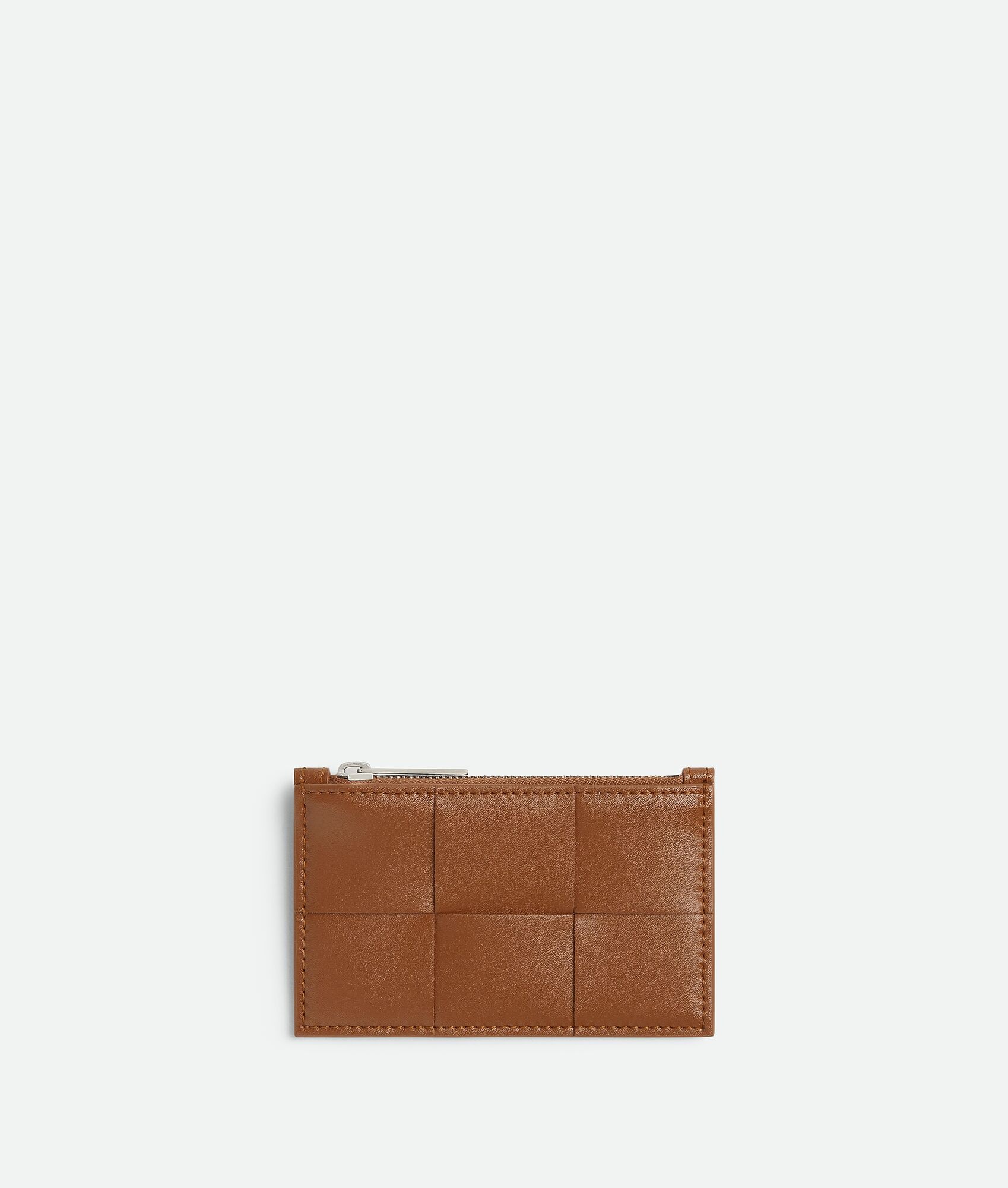 Intreccio calfskin leather card case with contrasted interior. Product Details - Three card slots, one zippered coin purse - Material: Calfskin - Lining: Calfskin - Color: Cognac/Space - Hardware: Silver finish - Height: 7.5 cm | 3" - Width: 11.8 cm | 4.6" - Depth: 0.5 cm | 0.2" - Made in: Italy - Product code: 749456VBWD42592