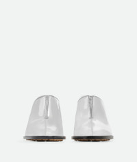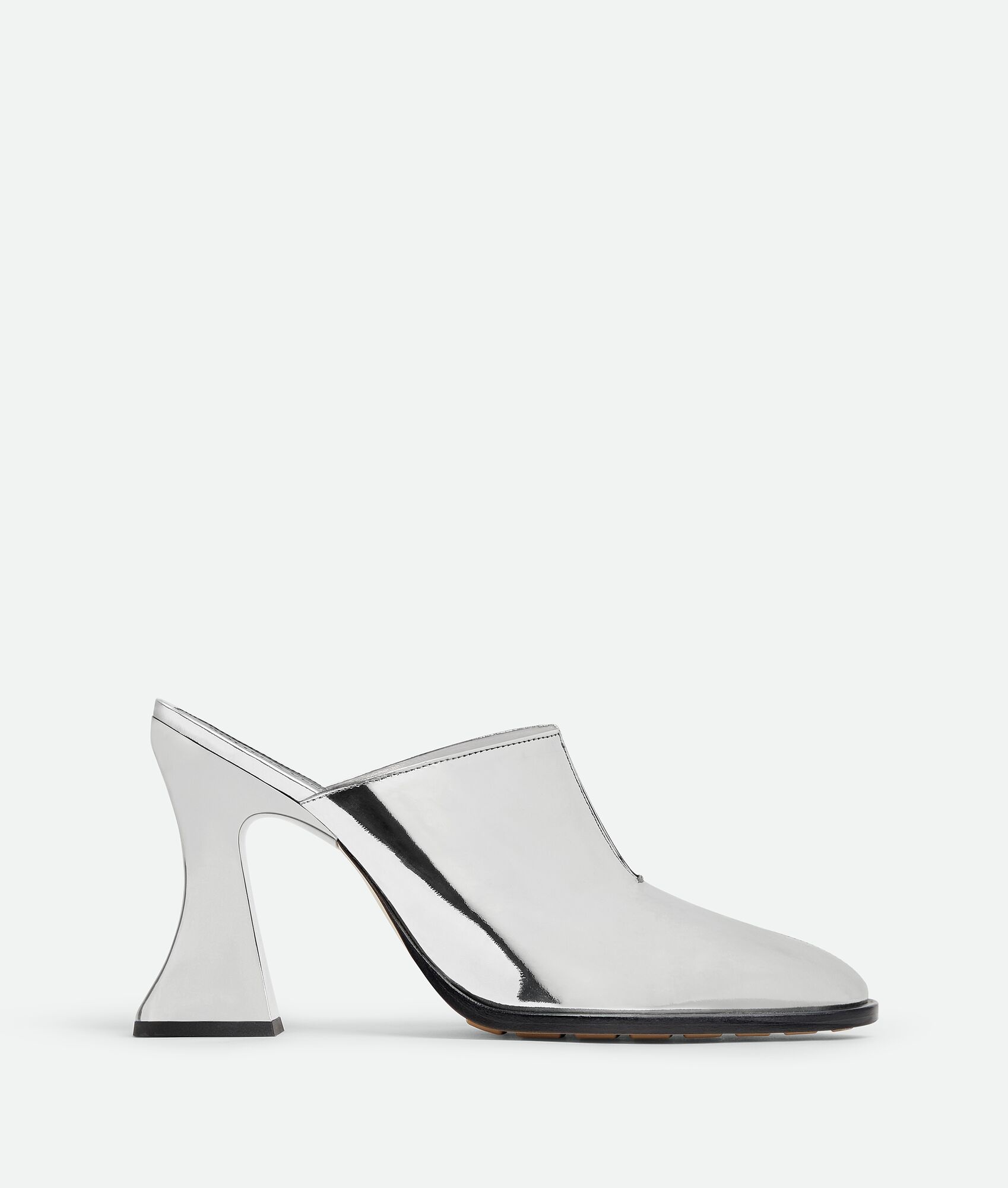 Reflective lambskin leather mule pump with sculptural heel. Product details • Reflective leather mule pump Material: 100% Lambskin • Lining: Lambskin • Color: Silver/Black • Rubber-injected leather outsole • Heel: 10 cm | 3.9” Made in: Italy