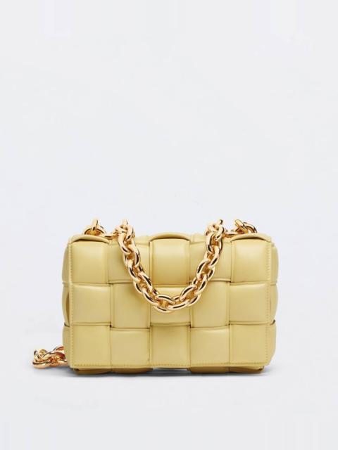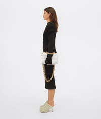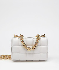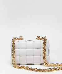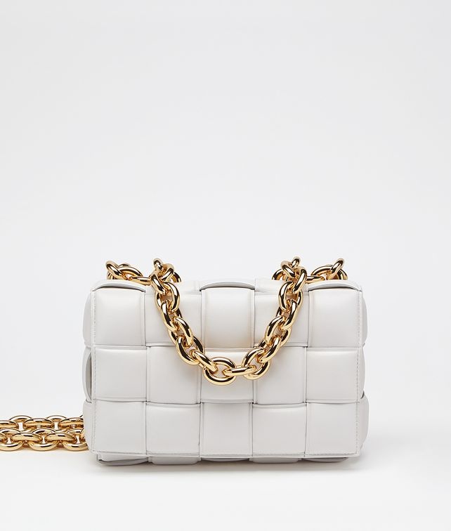 • Cross-body bag in maxi Intrecciato Nappa leather • Padded double-face shiny Nappa strips in an orthogonal weave • Chain strap • Interior zipped pocket • Magnetic closure • Bonded matte Nappa interior DETAILS Composition: 100% Lambskin Color: White Hardware: Gold finish Height: 18 cm / 7.1" Width: 26 cm / 10.2" Depth: 8 cm / 3.1" Handle drop: 13 cm / 5.1" Strap drop: 45 cm / 17.7" Made in Italy