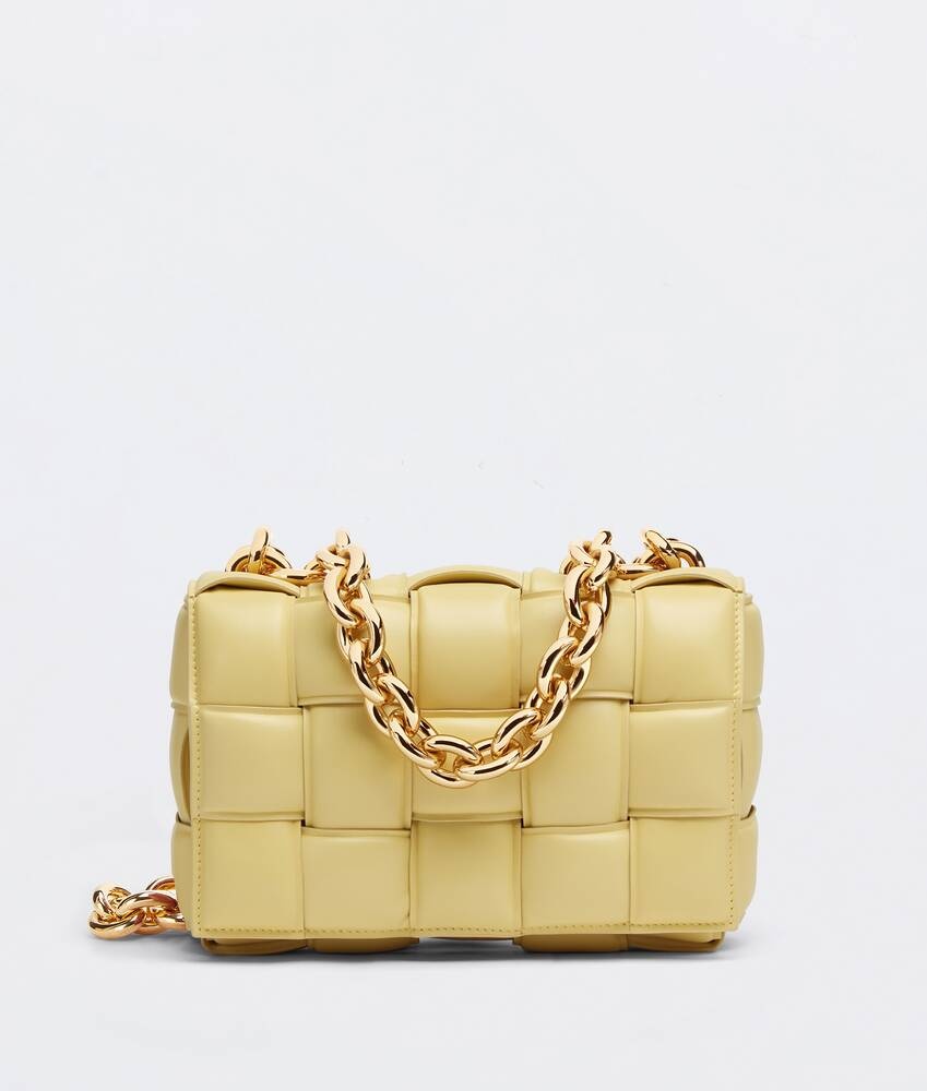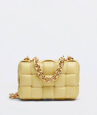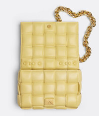 • Padded intrecciato leather crossbody bag • One interior zipped pocket • Metal closure Material: 100% Lambskin Lining: Bonded lambskin Color: Butter Hardware: Gold finish Height: 18 cm Width: 26 cm Depth: 8 cm Handle drop: 13 cm Strap drop: 45 cm Made in: italy