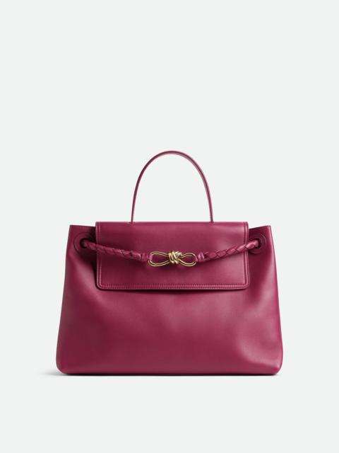 Top handle bag in silky calf leather with two-way flap and signature knot detail. Product Details - Silky calfskin leather top handle bag with two-way flap - Sliding shoulder carry strap - Adjustable and detachable cross-body strap - Compartmented interior with one zipped pocket - Hook closure - Material: Calfskin - Lining: Bonded suede - Color: Ecru - Hardware: Brass finish - Height: 26 cm | 10.2" - Width: 34cm - Depth: 15cm - Handle drop: 11.5cm - Strap drop: 55cm - Made in: Italy - Product code: 817231V4O929614