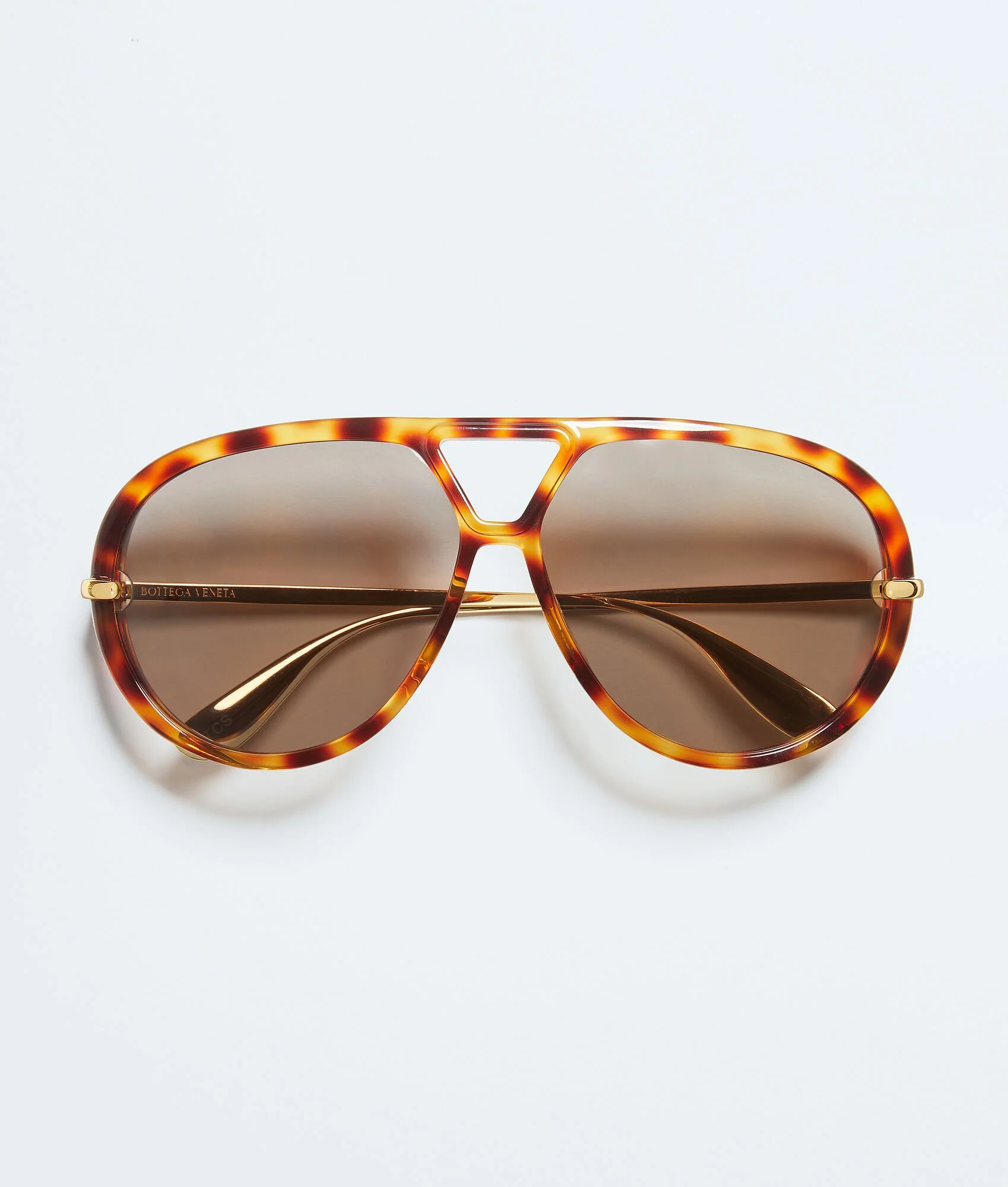 Aviator sunglasses in recycled acetate with sleek gold-finished temples. Product Details - Aviator sunglasses made with Eastman Acetate Renew, an acetate with 27% recycled content and gold-finished metal - Lenses made from polyamide with 39% bio-based content - BV1274S 005 - Colour: Havana/Brown - Made in: Japan - Product code: 769232V2Q301316 Material - Material: recycled acetate Size & Fit - Lens width: 63 mm | 2.5" - Bridge length: 13 mm | 0.5" - Temple length: 140 mm | 5.8"