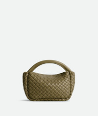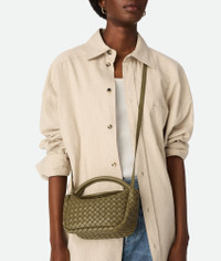 Top handle bag crafted in soft padded Intreccio leather with detachable strap. Product Details - Small padded Intreccio leather top handle bag with detachable leather strap - Flap closure secured with magnet - Material: lambskin - Lining: Unlined - Color: Algae - Hardware: Brass finish - Height: 11 cm | 4.3” - Width: 23 cm | 9” - Depth: 8 cm | 3.1” - Handle drop: 8.5 cm | 3.3” - Strap drop: 60 cm | 23.6” - Made in: Italy - Product code: 805739V3RG12937