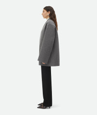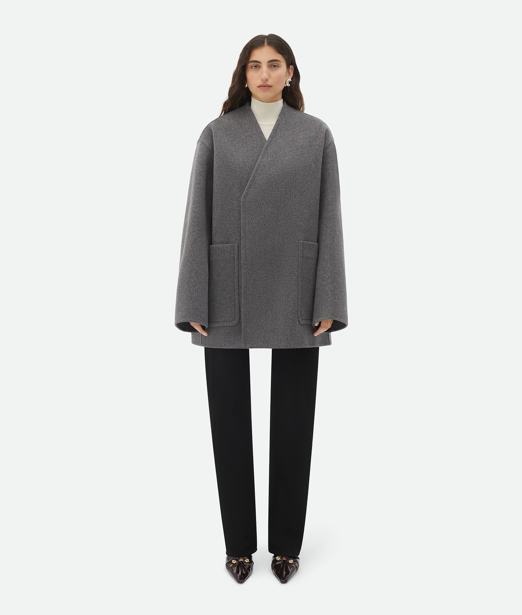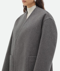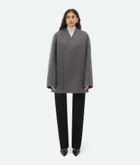 Melange cashmere collarless coat. Product details • Melange cashmere collarless coat • Turned-up sleeve detail • Unlined • Oversized fit Material: 100% Cashmere • Color: Medium Gray Melange Made in: Italy