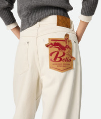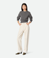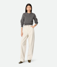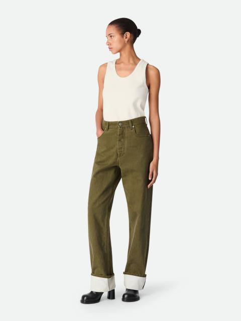 Jeans with wide leg and contrasted turned up hem in coloured stone washed denim. Product Details - Stone washed colored jeans - Contrasted turned up hem - Wide leg - Intrecciato suede back patch - Removable jumping hare patch on the back pocket - Button closure - Material: 100% Cotton - Color: Pale Meringue - Made in: Italy - Product code: 824659V5DV09247 Size & Fit - Model is 178 cm | 5'10" and is wearing a Bottega Veneta size 38